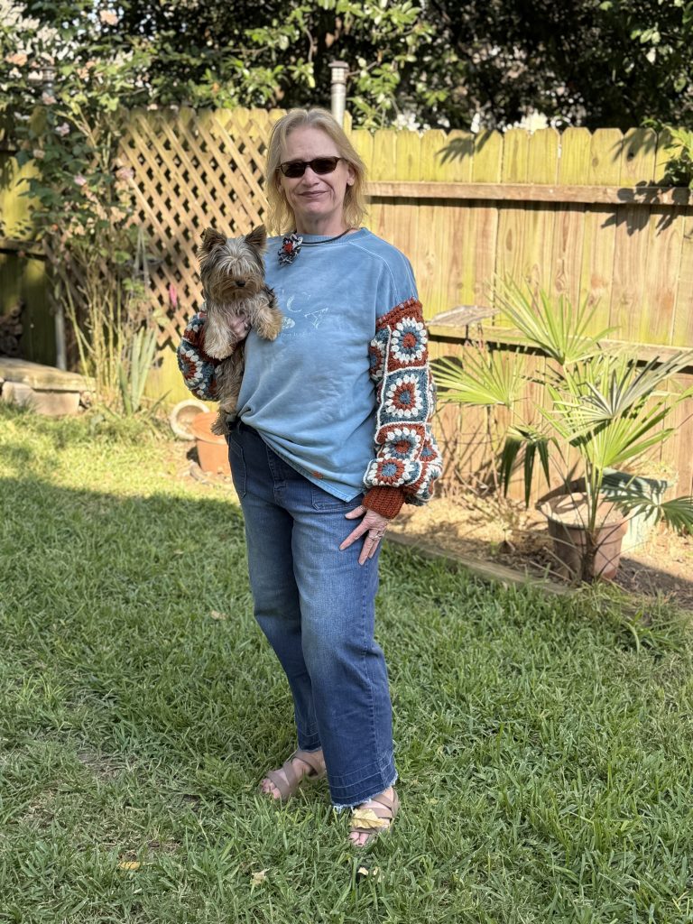 In the picture, I’m also showcasing another friends craft – Jessica from jessicanized; she upcycles / customizes sweaters and sweatshirts.