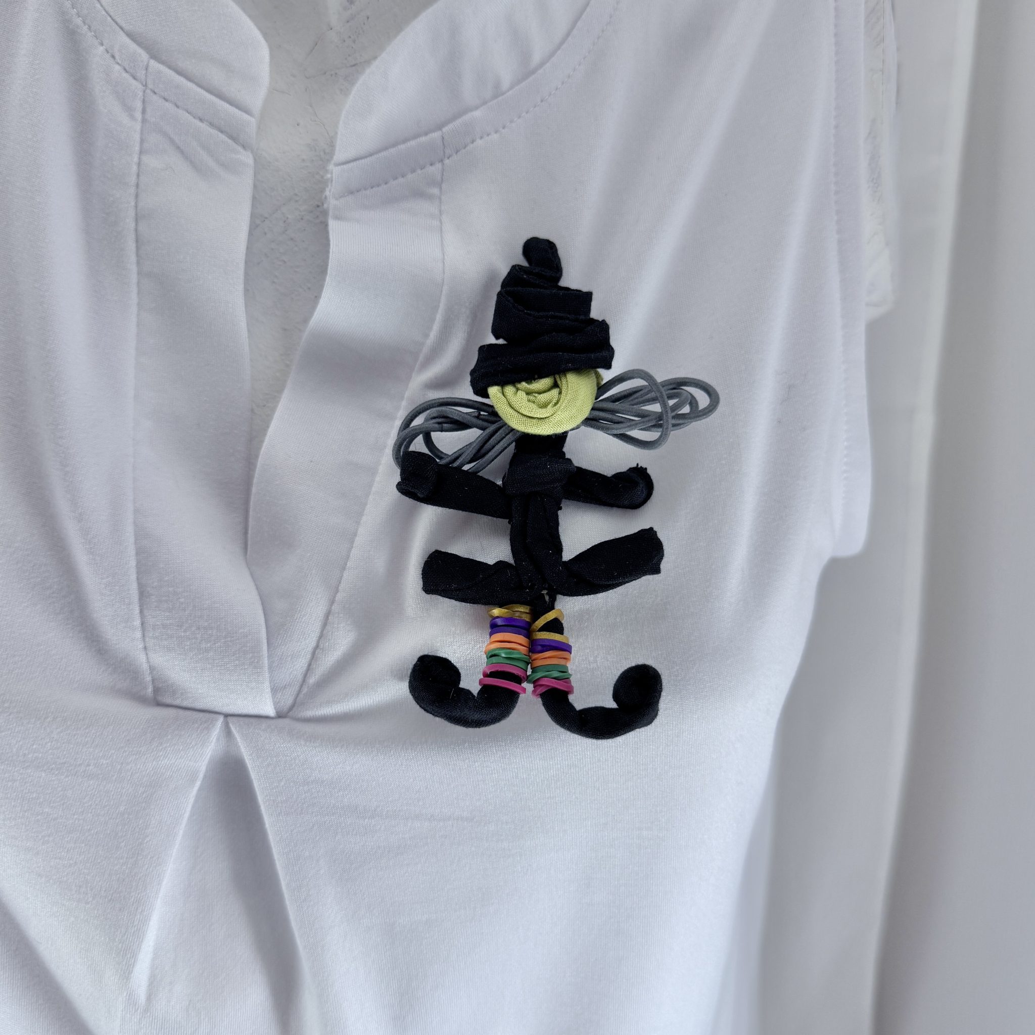 Finally, we managed to make a darling witch pin after nine iterations and a magic spell! She’s got the classic green pallor, gray “hair”, a pointy hat, striped socks, and a weird fancy dress. She comes with a pin back and a magnet.
